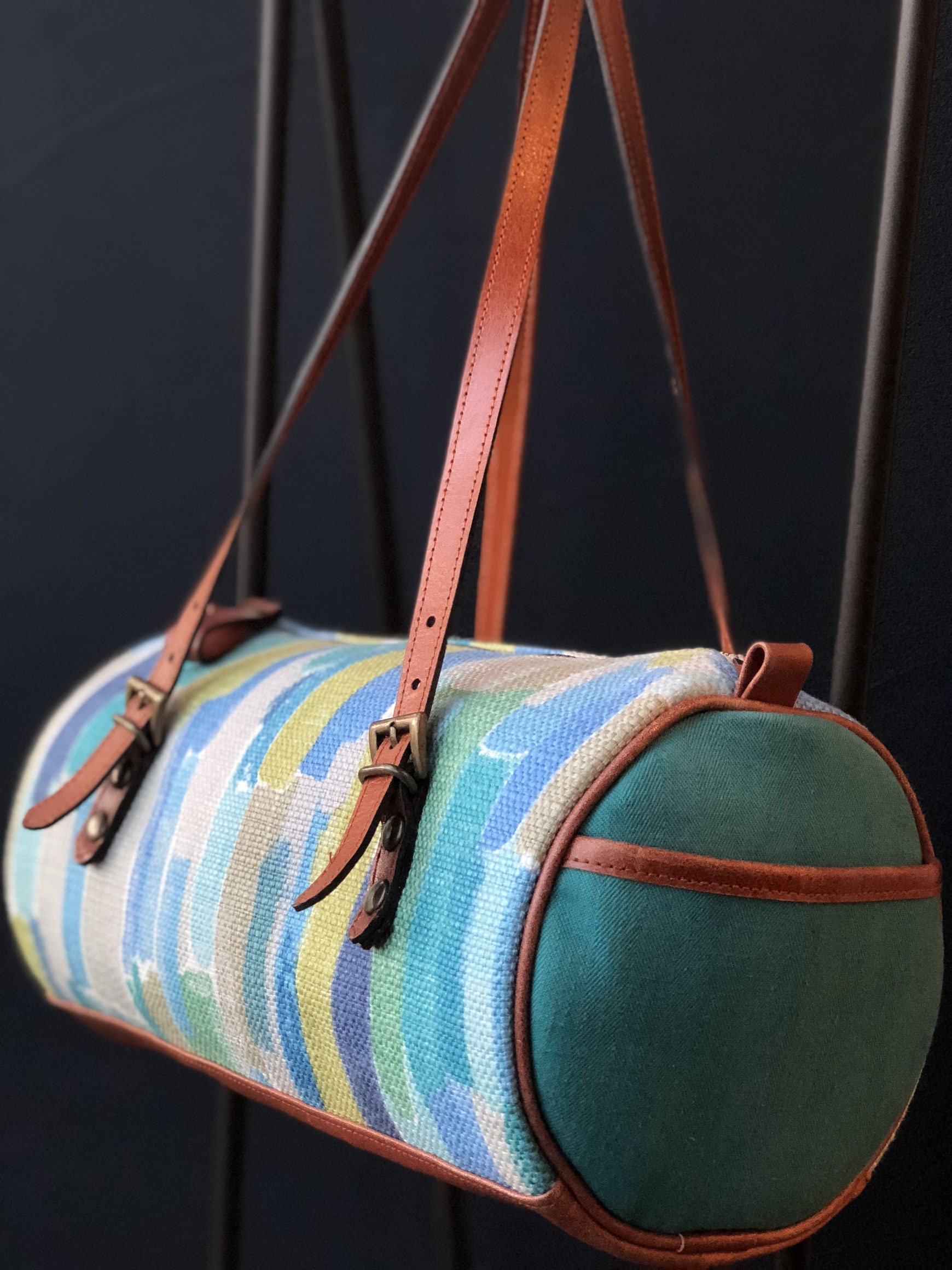 手書き風なデザインが印象的なFabricに柿渋を使用しためずらしい革をアクセントに。