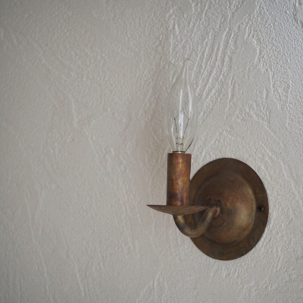 寝室にはアンティークの照明。表情のある塗り壁も素敵です。