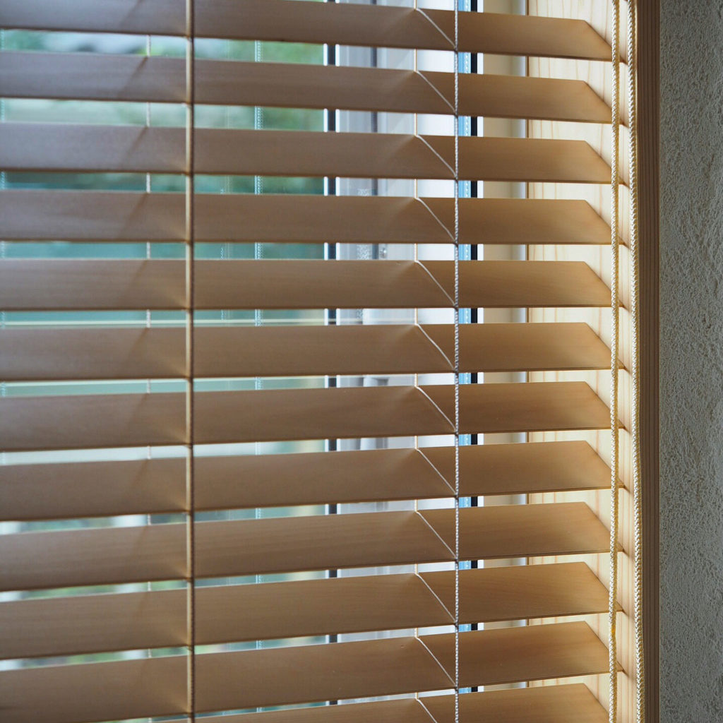 次に大きな窓の左横にFIX窓。こちらはあえて同じ生地にはせず、枠の内側に木製ブラインドとしました。まるで枠に組み込まれた桟のように、窓まわりがすっきり見えます。
