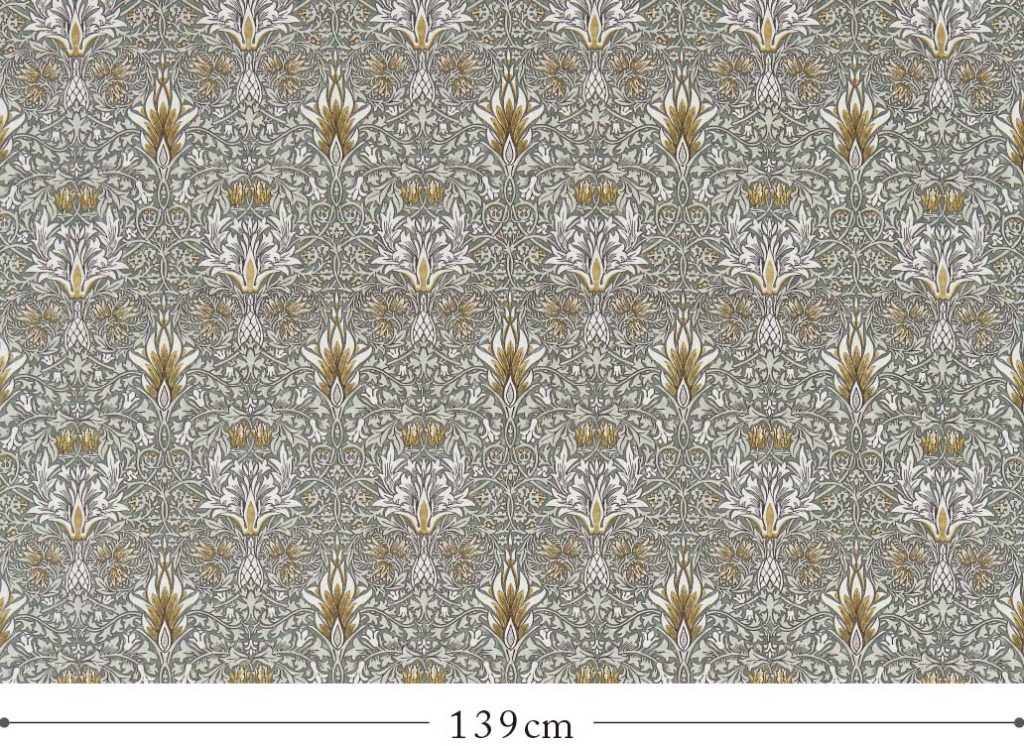 1点目はウイリアムモリスのスネークヘッド。こちらの生地は、ウイリアムモリスモリスが研究していたインドのテキスタイルの色や模様の影響を受けたパターンのひとつ。「スネークヘッド(蛇の頭)」と呼ばれる釣鐘型のフリティラリアの花がより大きくフォーマルなモチーフを彩っています。