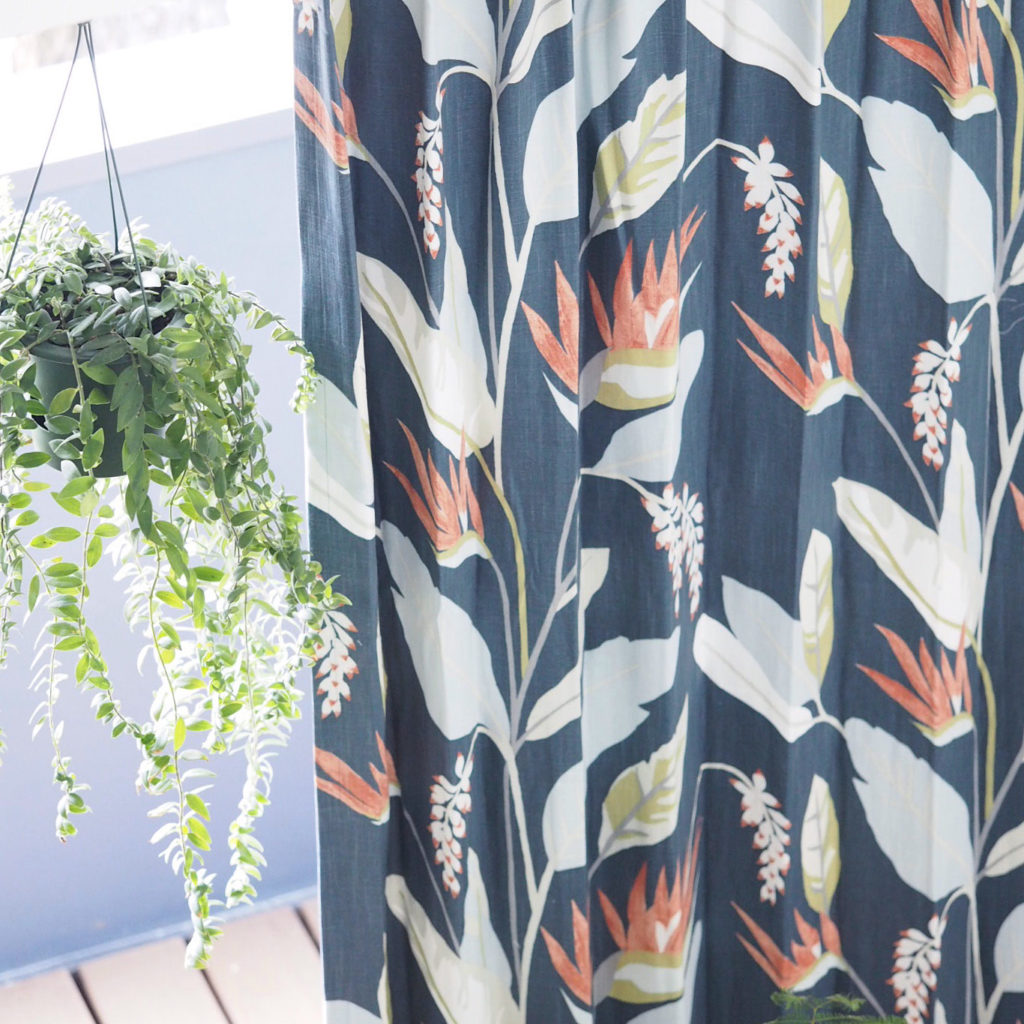 床までの窓はカーテンスタイル。大胆な柄なのでヒダは少なめでサラッとシンプルに。観葉植物との相性も抜群!日差し強く差し込む窓なのでこちらは遮光裏地付き。