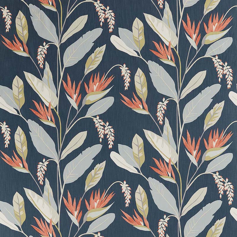 もうひとつの柄がこちらイギリス製の生地。スペイン・イビサ島の丘に建つヴィラからインスピレーションを受けたコレクションより、手描きのストレリチアの花をグラフィカルにデザインしたプリント生地でスラブ感のある糸を使用したコットンリネンのブルー地にオレンジの色で描かれた花が映えます。