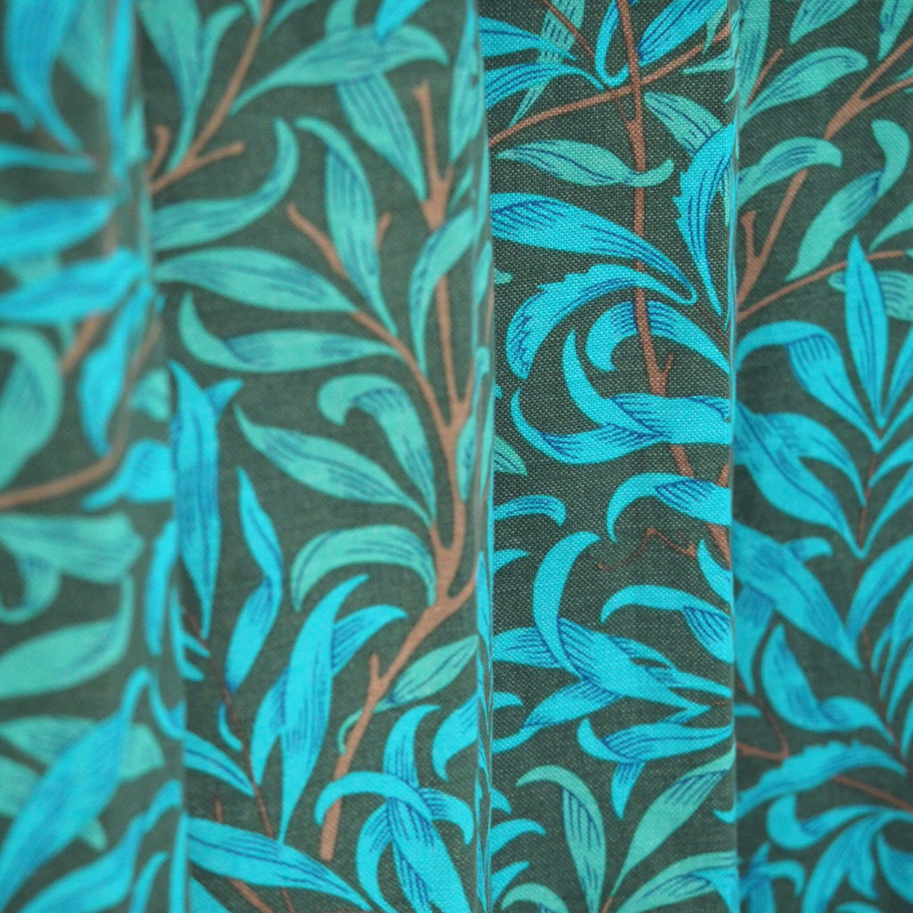 ベースは落ち着いたオリーブ色、風が吹いてるかのようなしなやかなターコイズ色の柳の葉、レンガ色の幹がアクセント