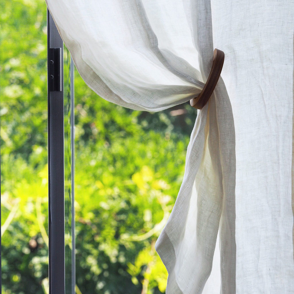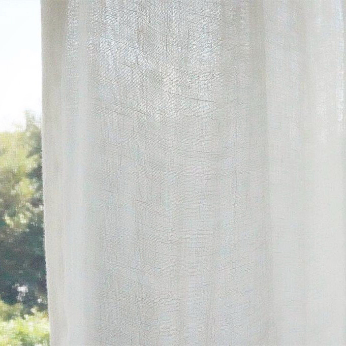 あまく撚って織り上げたリネンガーゼの糸は、太陽の光を透すことで、室内に柔らかな光を運んでくれます。 厚みを感じないエアリーな生地ですが、2枚の織物を重ねたようなダブルガーゼの効果によって、外からの視線もしっかり遮ります