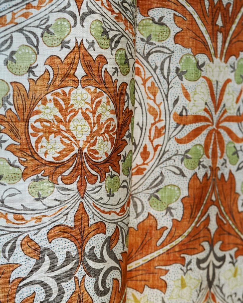 ザクロやチューリップを繊細に描かれた花やリンゴ、流れるようなアカンサスの葉で囲んでいるデザイン