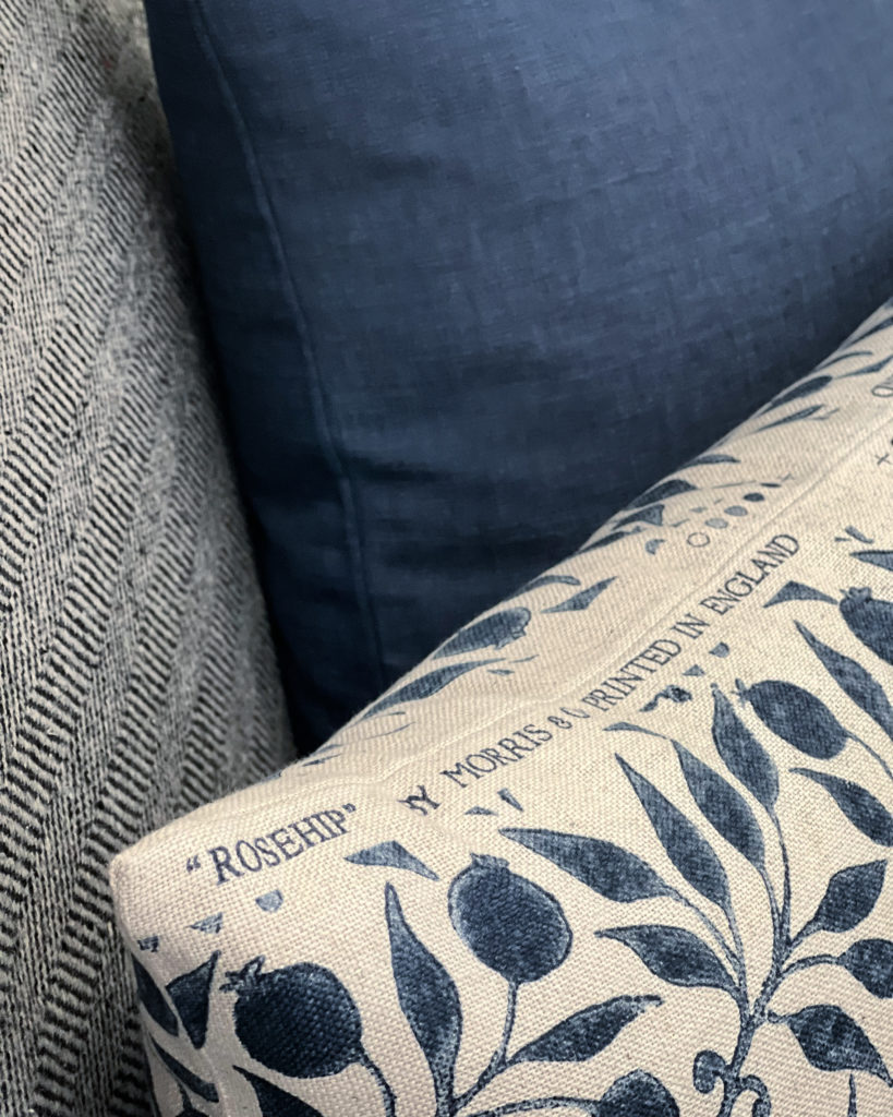 バラの実のクッションは通常隠してしまう生地のロゴをあえて見せてアクセントに