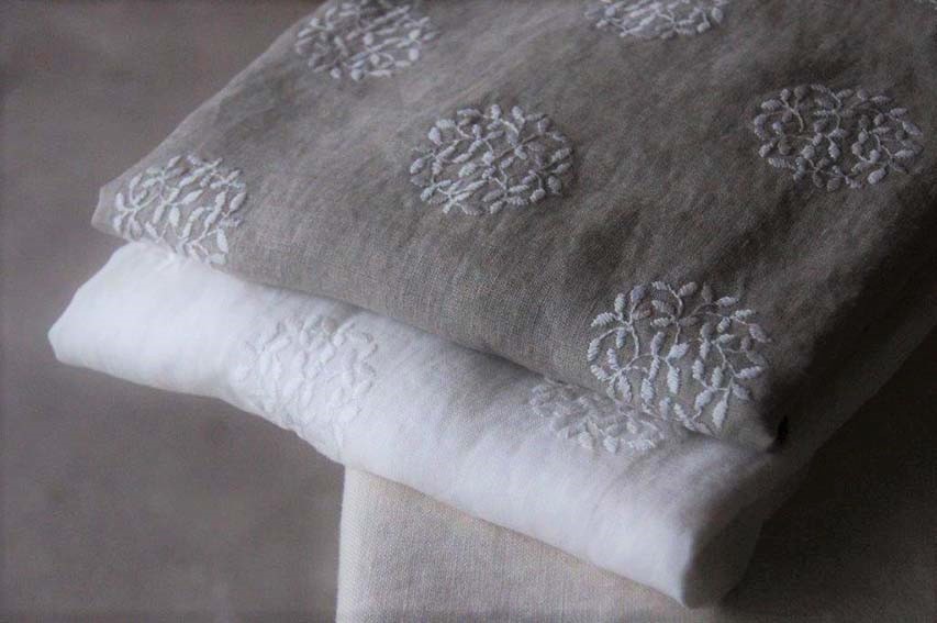 お選び頂いたのは、柔らかい薄手の生地に刺繍が施されているこちらのリネン生地「ハナグルマ」
