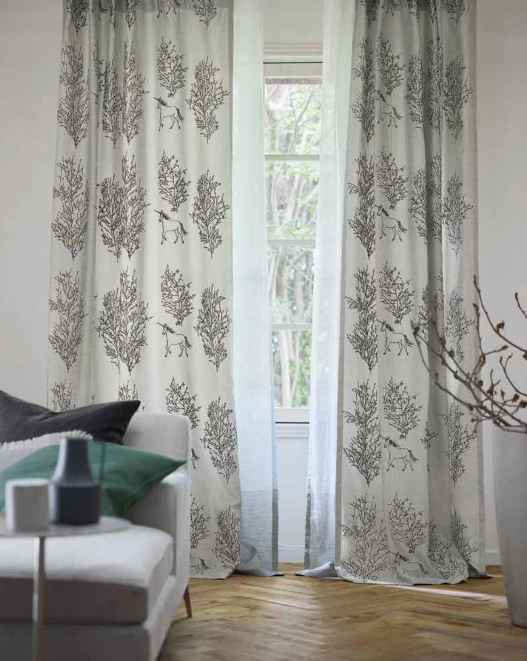 北欧のデザイナーが線画で書いた絵をグレーベースの織生地に黒の刺繍糸でステッチしています。モノトーン系でシックの中にも陰影があり落ち着いた素敵な生地です。
