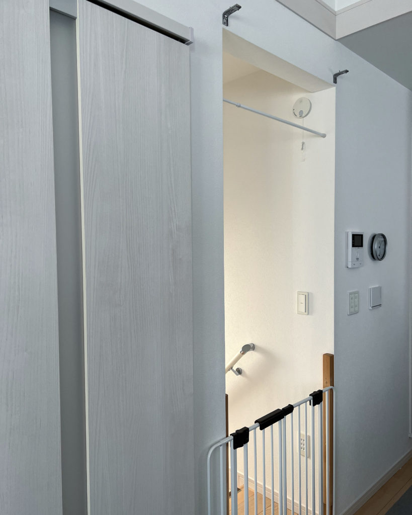 階段の開口部の先にはリビングのカーテン、 統一感が生まれスッキリとした印象に。 少しだけ下げてタペストリーのように 楽しむのもいいですね。
