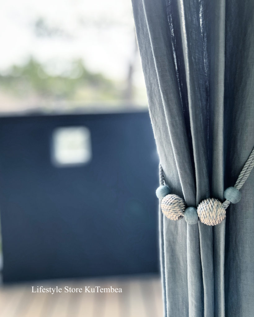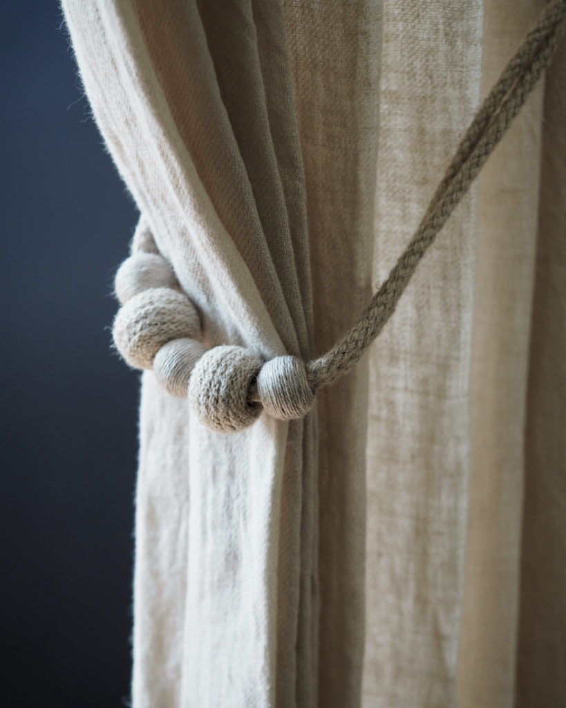 無地で素材感のシンプルなカーテンだからこそ装飾タッセルを合わせる事で存在感が増してきますね。
