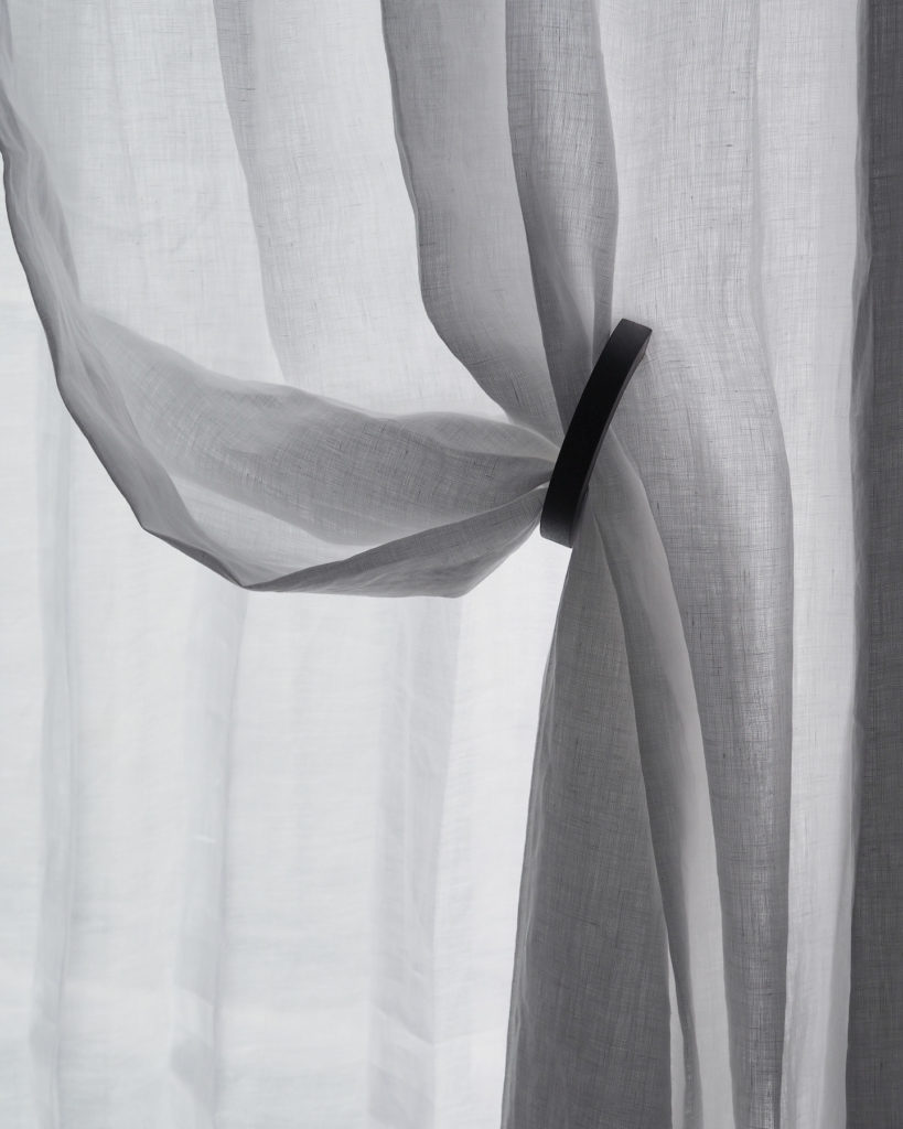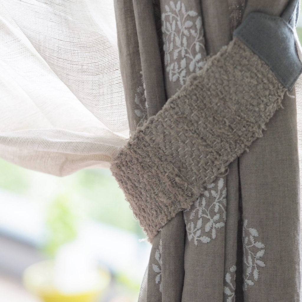 無地で素材感のシンプルなカーテンだからこそ装飾タッセルを合わせる事で存在感が増してきますね。