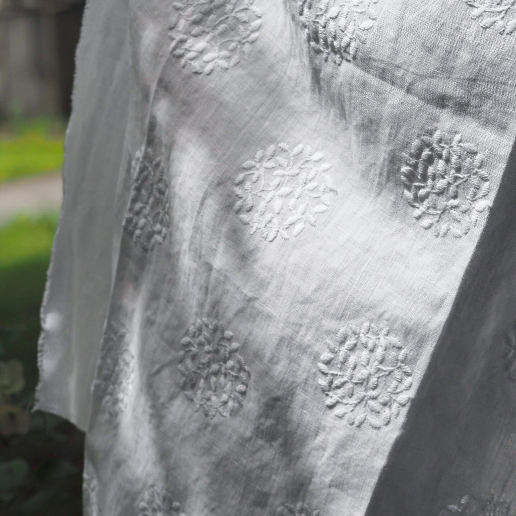 リネンベースのファブリックにレモンをメインに、枝や花を細かく刺繍されたイエローとグリーンの色合いが、リラックスした印象