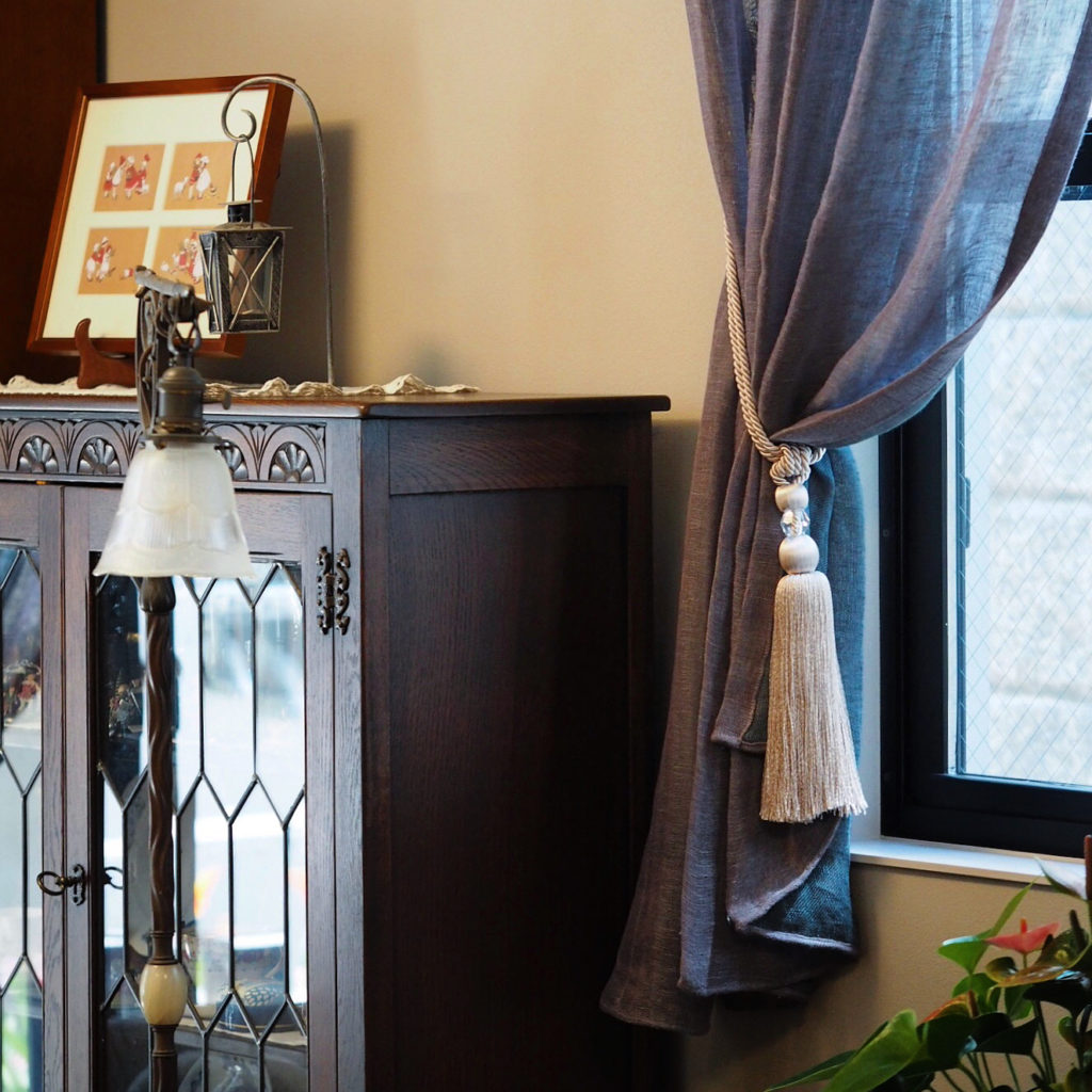 事前にカーテンのサンプルを見ながらお打ち合わせして製作して頂いたので、色合いも含めカーテンとピッタリなタッセルに。