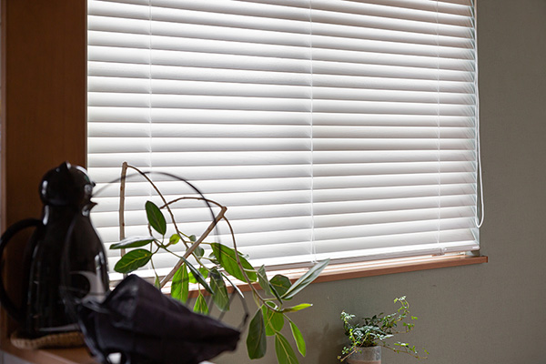 次に大きな窓の左横にFIX窓。こちらはあえて同じ生地にはせず、枠の内側に木製ブラインドとしました。まるで枠に組み込まれた桟のように、窓まわりがすっきり見えます。