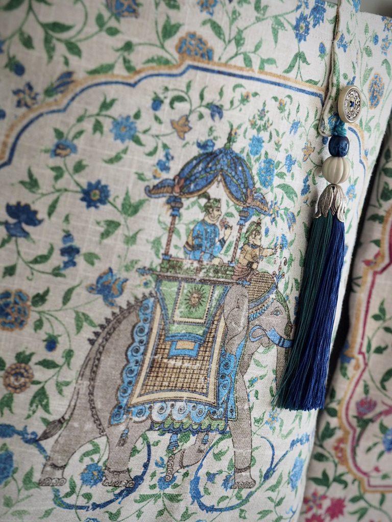タッセルは柄の中から2色をチョイスして、ツートンカラーの房に仕上げました。