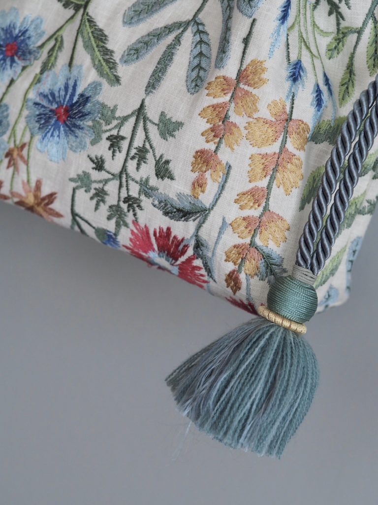 リネン地にワイルドフラワーを繊細に刺繍した、モダンな多色使いのフローラルファブリックを使用しました。